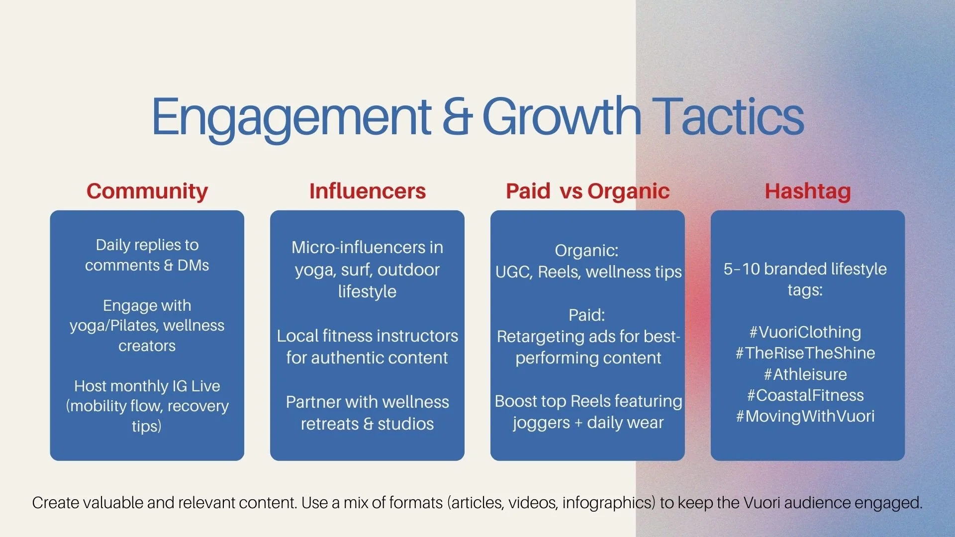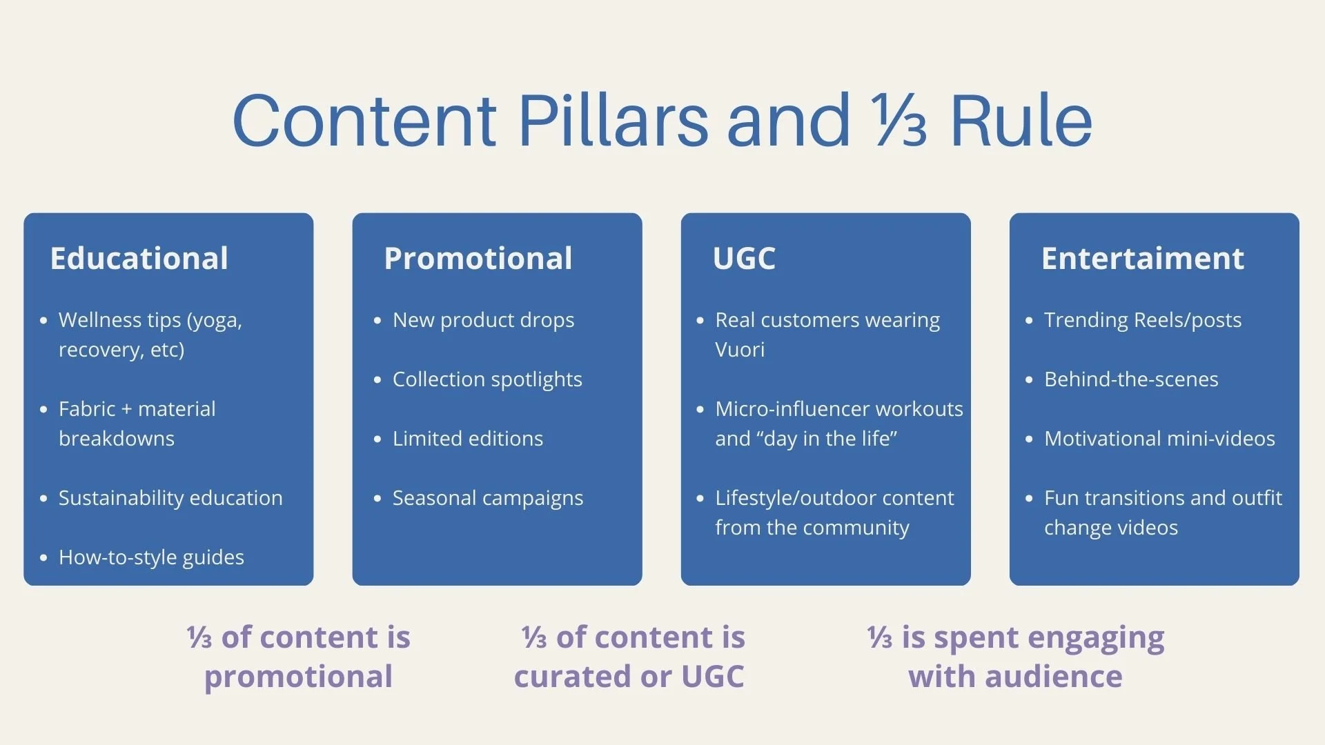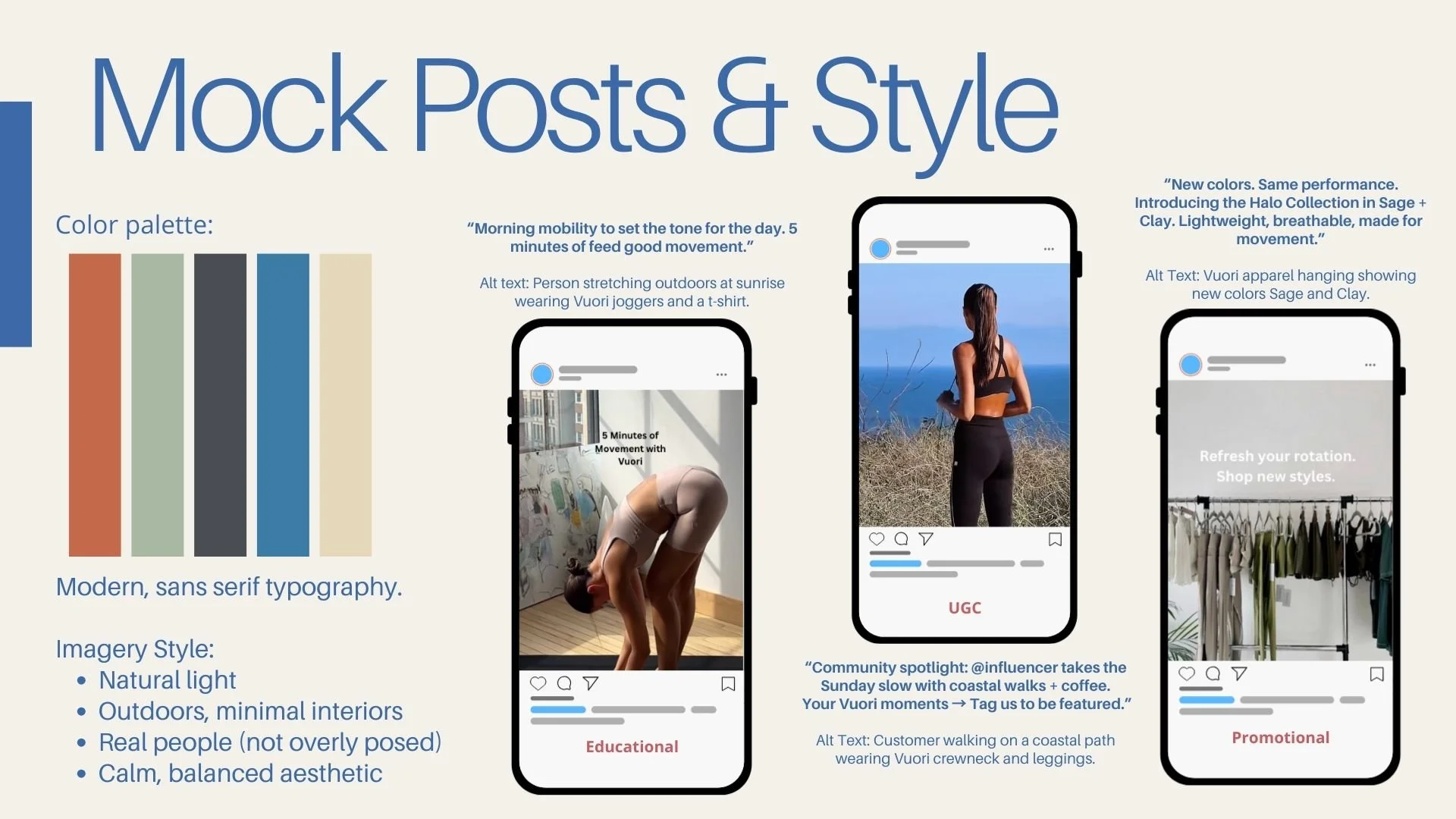 This content strategy positions Vuori as more than just activewear, further positioning it as a lifestyle brand rooted in wellness, movement, and everyday balance. While Vuori already emphasizes performance and comfort, the opportunity is to deepen its connection with consumers through intentional, story-driven content that reflects how people actually live—blending fitness, leisure, and mindfulness. The strategy focuses on building a more immersive and community-driven brand experience.
